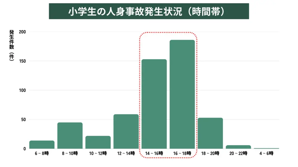 警視庁が発表している小学生の交通人身事故発生状況(令和7年上半期)によると、小学生の交通事故は14時~18時の下校の時間帯多く発生しています。(※)
