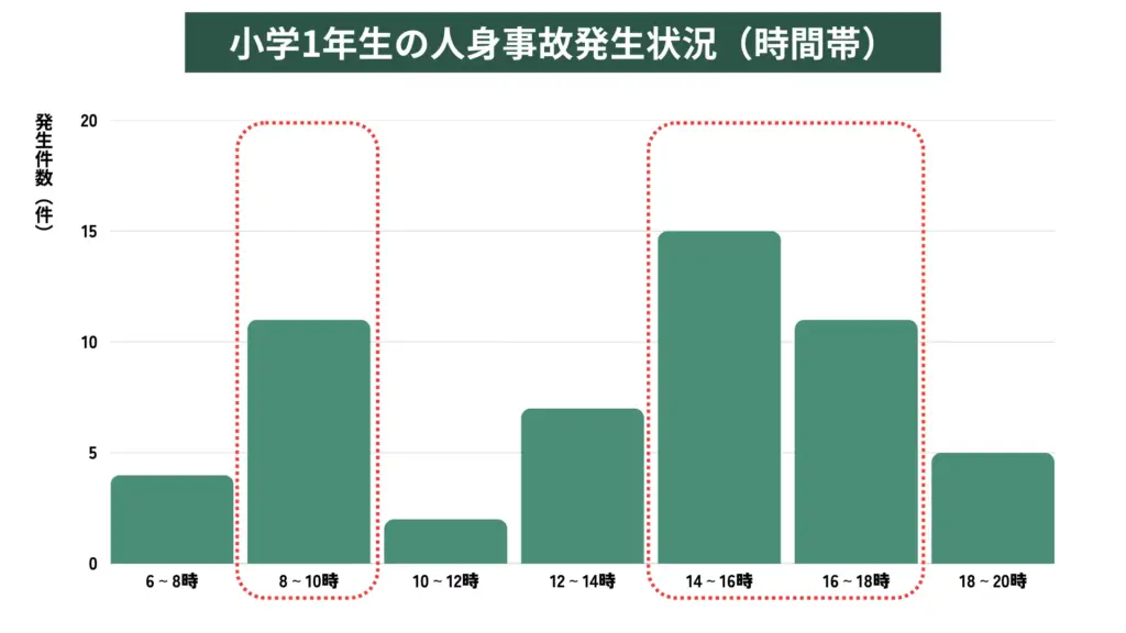 さらに小学1年生にしぼって、事故にあった時間帯をみていくと、事故は朝の登校時間も加わり、8時〜10時と14時〜18時の時間帯に事故が多くなっていますよ。(※)