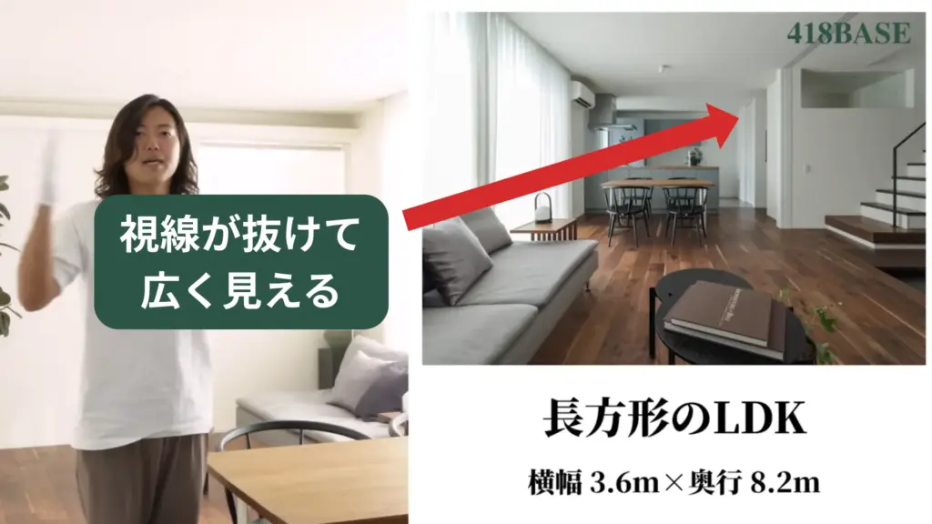 一方、I型(長方形)のLDKは対角線の長さが長く、視線が届きやすいため、同じ広さでもより広く感じられるでしょう。