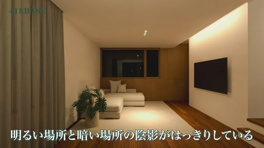 あえて光の陰影を意図的に作り出すことで、リビングが癒しの空間になるでしょう。
