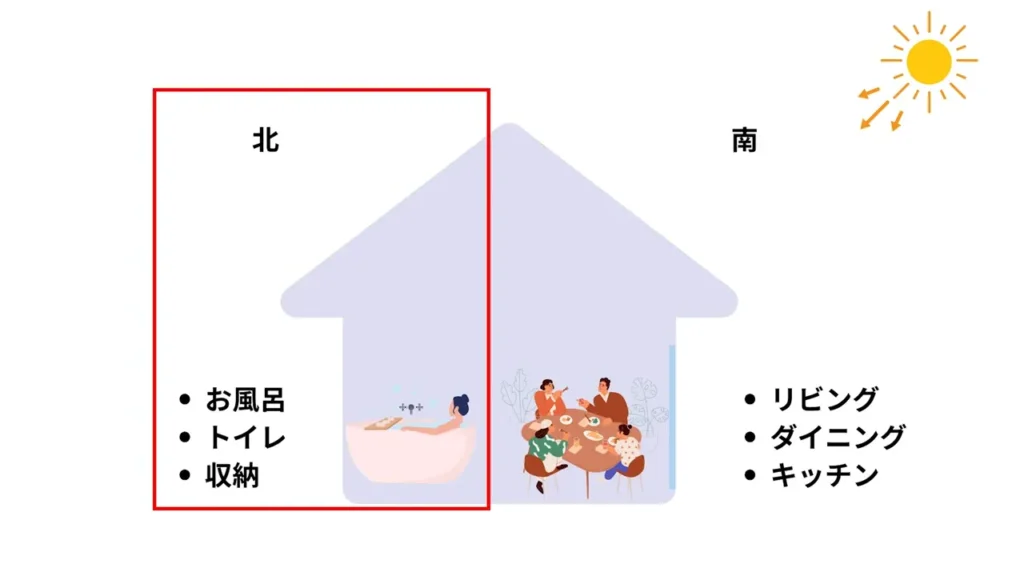 お風呂やトイレなどの水回りは、日当たりをそれほど必要としないため、北側に配置するケースが多いです。