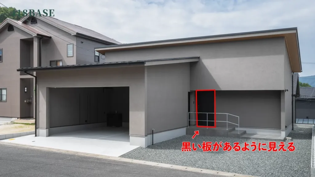 玄関ドアは一枚の黒い板のように見え、アクセントになりながらも、建物全体のデザインを邪魔しない仕上がりになっていますよ。