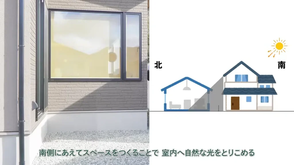 - 建物の配置や形状を工夫することで、北面道路の土地でも日当たりを確保できる