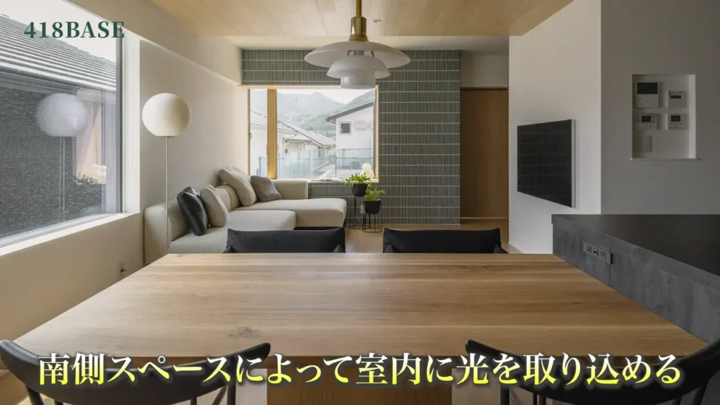 実例では、リビングダイニングの一角を凹ませることで、南側の家の影響を受けずに日光を取りこむことができていますよね。