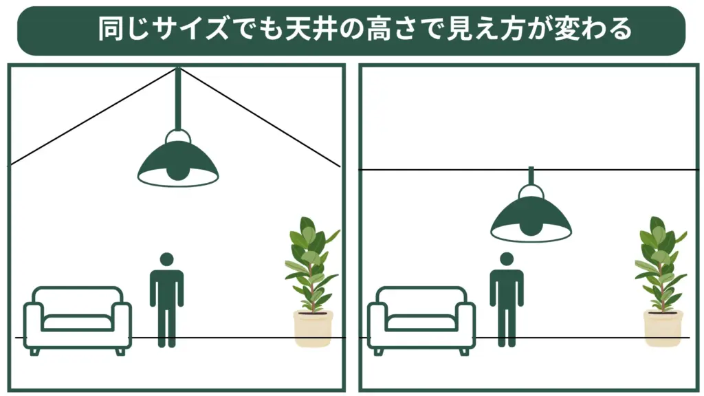 空間の広さや天井の高さ、視線の抜け方、そしてインテリアとしての存在感をふまえながら、どのサイズが最もバランスよく感じられるのかを見ていきましょう。