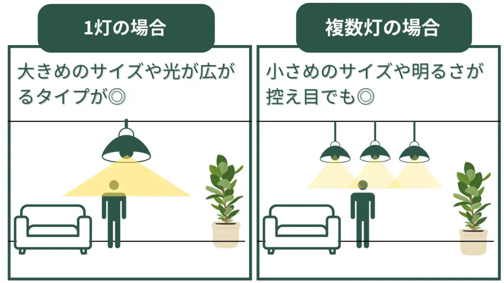 たとえば、1灯だけで部屋を照らす場合は、ある程度大きめのサイズや光が広がるタイプが必要です。