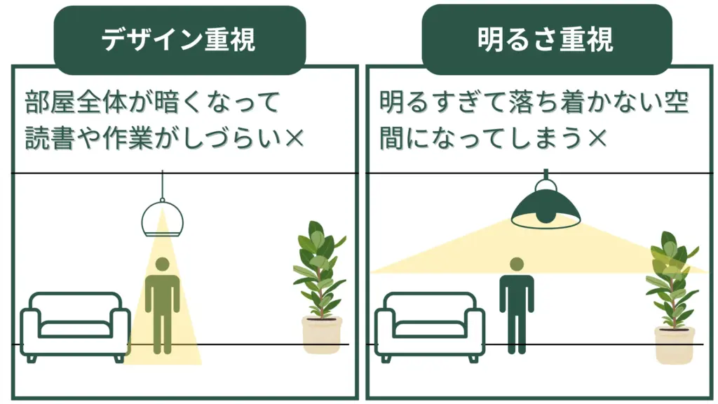 たとえば、デザインを重視して光が下方向だけのタイプを選んだり、小さめのシェードを選んだりしてしまうと、部屋全体が暗く感じてしまいますね。