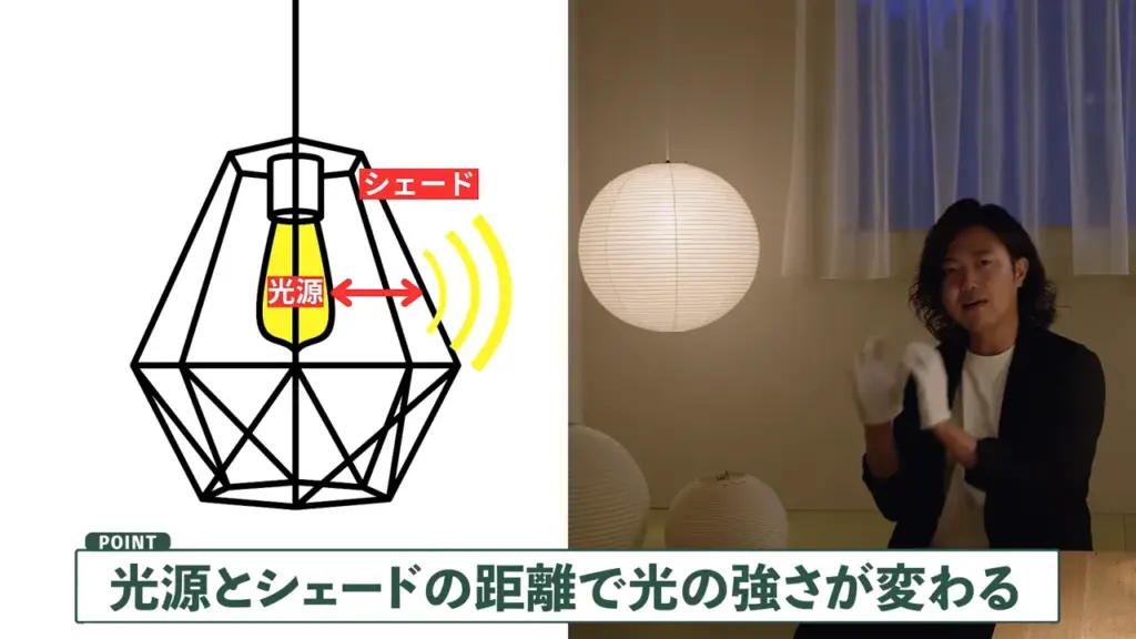 同じ明るさでも、光源とシェードの距離によって光の強さや届き方は変わります。