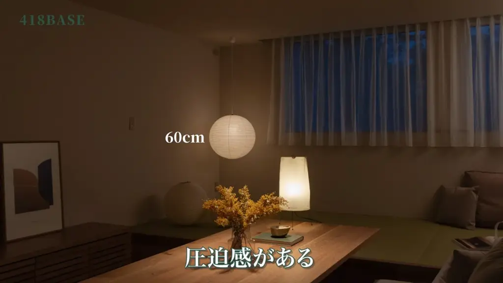 一方で、通常の天井高のリビングで同じサイズのライトを使うと、視線との距離が近くなるため、圧迫感を与えてしまうでしょう。