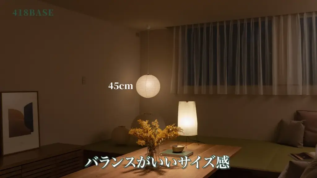 直径45cmのペンダントライトは、一般的な天井高(約2m40cm)~やや高めのリビングにちょうどいいサイズです。